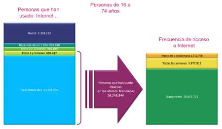 O número de persoas de 10 anos ou máis que accederon a Internet nalgunha ocasión supera os 29,5 millones en el año 2014, un 5,7% máis que hai 2 anos. Ademais se miramos cara a algúns dos tramos do tempo do ultimo uso de Internet, temos que o tramo dos últimos 3 meses medrou un 7,6% mentras que o tramo dos que hai máis dun ano diminuiu un 16,6%.