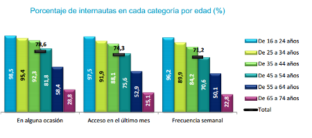 No referente a idade, en calquera das frecuencias de uso, os máis xóvenes, os de 16 a 24 anos son os que máis se conectan e a porcentaxe vai diminuíndo ata os tramos de idiade de 65 a 75 anos, que son os que menos se conectan.